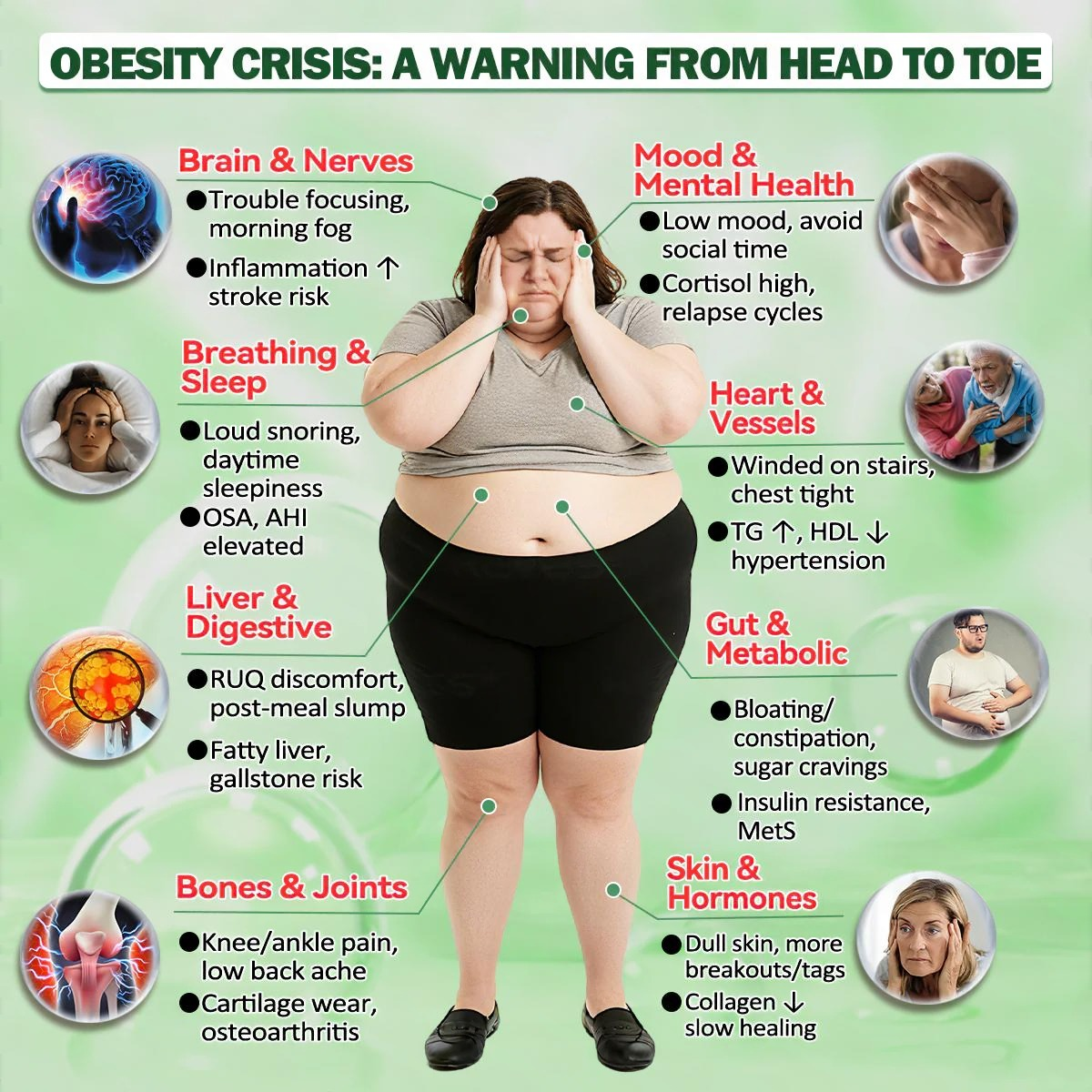 • Sleep apnea: Causes breathing interruptions and fatigue while increasing the risk of high blood pressure and heart disease.