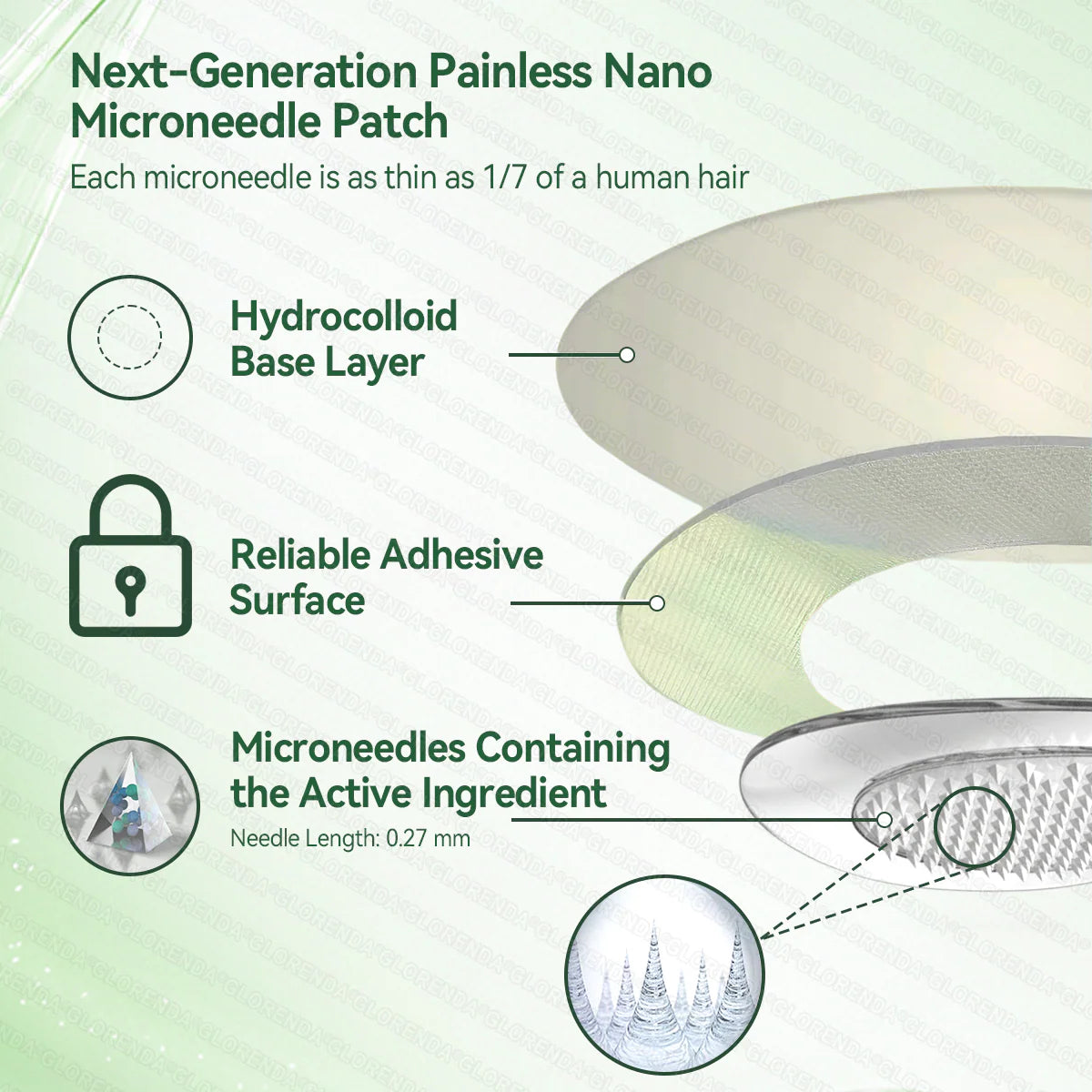 Our nano microneedle patch is dermatologically tested and precisely engineered to control the transdermal release of active ingredients. While the skin naturally acts as a strong barrier, this advanced nano microneedle system is specifically designed to penetrate that barrier safely and effectively. Each microneedle is just 0.27 mm in length—about one-seventh the thickness of a human hair—and made from dissolvable bioactive materials, ensuring a smooth, virtually painless application while delivering ingredients directly into the skin.