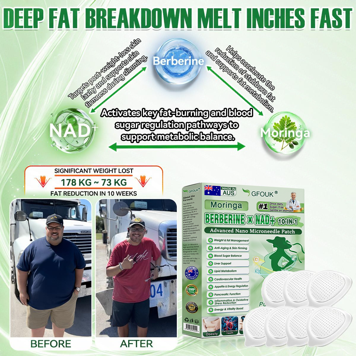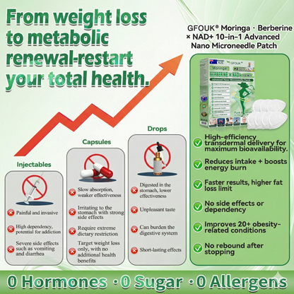 Having worked in a hospital pharmacy for years, I know firsthand the flaws of traditional weight-loss products: slow results, rebound weight gain, and poor metabolic support. Even with diet adjustments and increased exercise, my weight kept rising—until I tried the GFOUK® Moringa·Berberine × NAD+ 10-in-1 Advanced Nano Microneedle Patch.